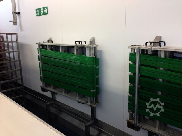 Rondo-linje til fin dej, oprindeligt opsat til produktion af tynd dej til samosa-fremstilling, men kan anvendes til enhver form for fin dejproduktion. Linjen starter med en hævet transportør, 6-valset dejextruder på 650 mm bredde, forskellige 700 mm brede transportbånd med guillotiner og melstrøere. Den var konfigureret til at skære dejen i stykker af 75 x 173 mm – 8 på tværs, 90 x 213 mm – 7 på tværs og 110 x 254 mm – 5 på tværs. Vi skal dog først verificere, om alle størrelser stadig er tilgængelige, da dette ikke er bekræftet, men blot aflæst fra ordresedlen. Linjens samlede længde er ca. 22 meter. Alle bånd er mørnede, da linjen har været opbevaret sikkert i mange år og ikke kunne sælges til konkurrenter i Storbritannien.